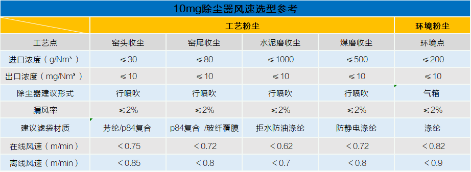 1、設備選型優化,布袋式除塵器過濾風速的大小決定了袋式除塵器整體的運行效率和成本的大小,為了達到更低的排放標準,更慢的過濾風速可以保證更高的過濾精度,在10mg排放以下布袋除塵器選型上我們將總風速降低到0.8/min左右,凈過濾風速降低到0.9m/min以下,確保更久的過濾時間,(5mg需要更進一步降低1個等級,具體以工藝點而定,在大風量及濃度較高除塵中,我們建議采用行噴式除塵結構)將漏風率控制:系統漏風率<2%,系統阻力<1200Pa,除塵濾袋在此工況下可以確保更久的使用壽命。