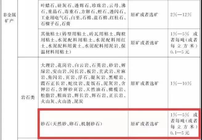 據此前《中華人民共和國資源稅法(征求意見稿)》透露內容顯示:對砂石(天然砂、卵石、機制砂石)征收1%-5%或者1元-10元/立方米資源稅。稅法規定對衰竭期礦山開采的礦產品減征30%資源稅,授權各省對低品位礦減免資源稅。