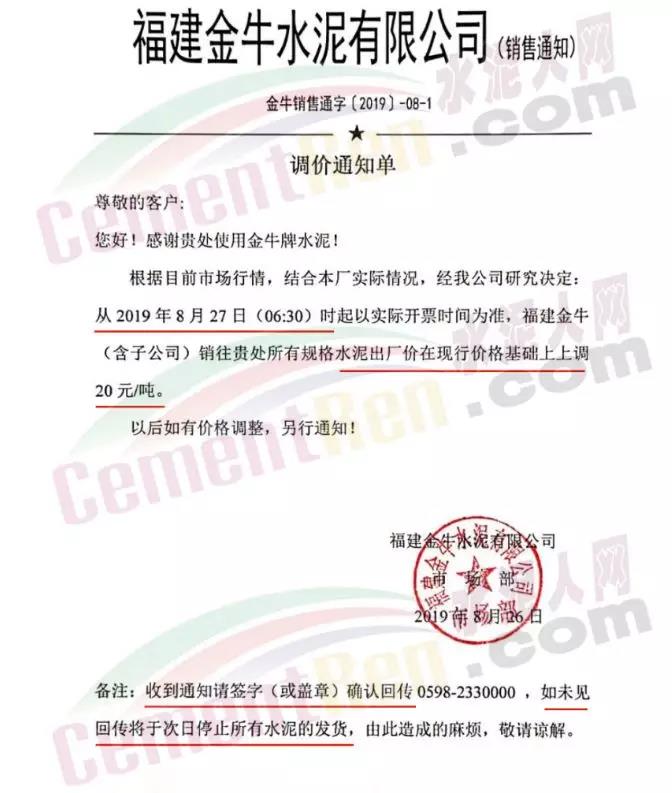 金牛水泥特別強調,收到通知請簽字回傳,如未見回傳將于次日停止所有水泥的發貨。這是福建金牛水泥8月份的第二次提價,累計上調40元/噸。