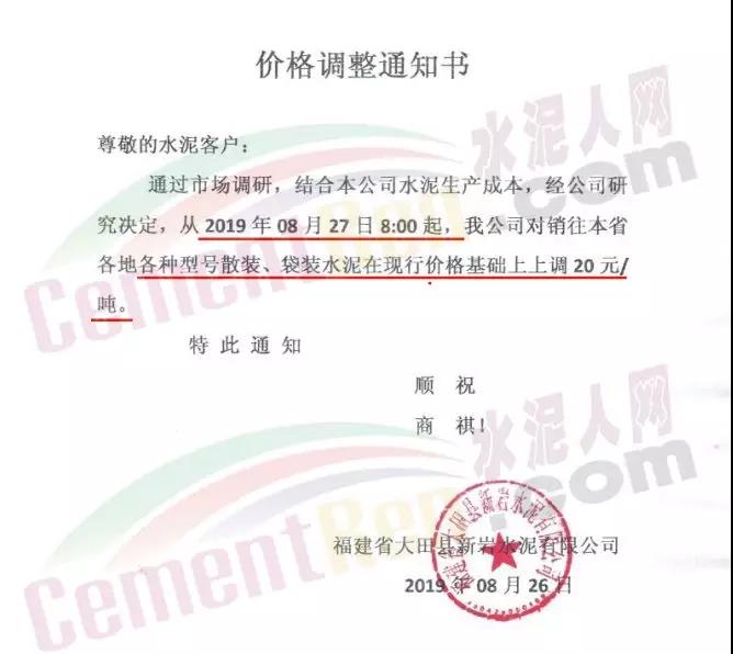 8月26日,福建省大田縣鑫城水泥工業有限公司發布調價通知稱:基于目前市場行情,結合我司實際情況,我公司經研究決定,自2019年8月27日00:00時起,我公司發往福建省境全區域的各品牌、品牌散裝、袋裝水泥的出廠價格在原有的基礎上上調20元/噸。
