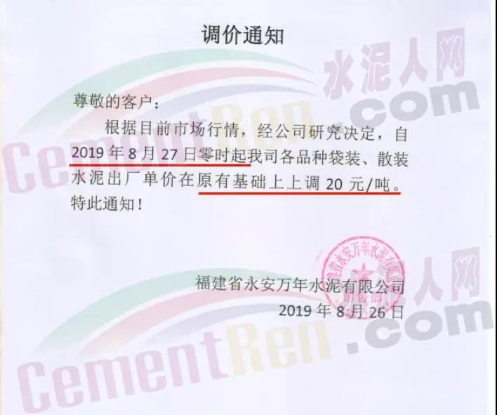 8月26日,福建省永安萬年水泥有限公司發布調價通知稱:根據目前市場行情,經公司研究決定,自2019年8月27日零時起我司各品種袋裝、散裝水泥出廠單價在原有基礎上上調20元/噸。這是福建永安萬年水泥8月份第二次提價,累計上調40元/噸。