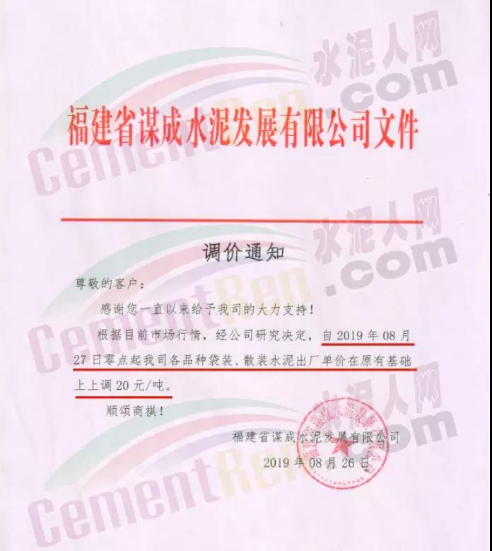 8月26日。福建省謀成水泥發展有限公司發布調價通知稱:根據目前市場行情,經公司研究決定,自2019年8月27日零時起,我司各品種袋裝、散裝水泥出廠單價在原有基礎上上調20元/噸,本次調價為謀成水泥8月份的第二調價,累計上調40元/噸。