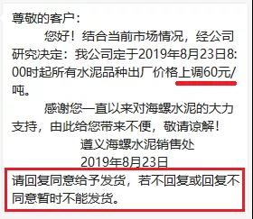 8月26日,福建省大田縣新巖水泥有限公司發布價格調通知稱:通過市場調研,結合本公司水泥生產成本,經公司研究決定,從2019年8月27日8:00起,我公司對銷往本省各地各種型號散裝、袋裝水泥在再行價格基礎上上調20元/噸。