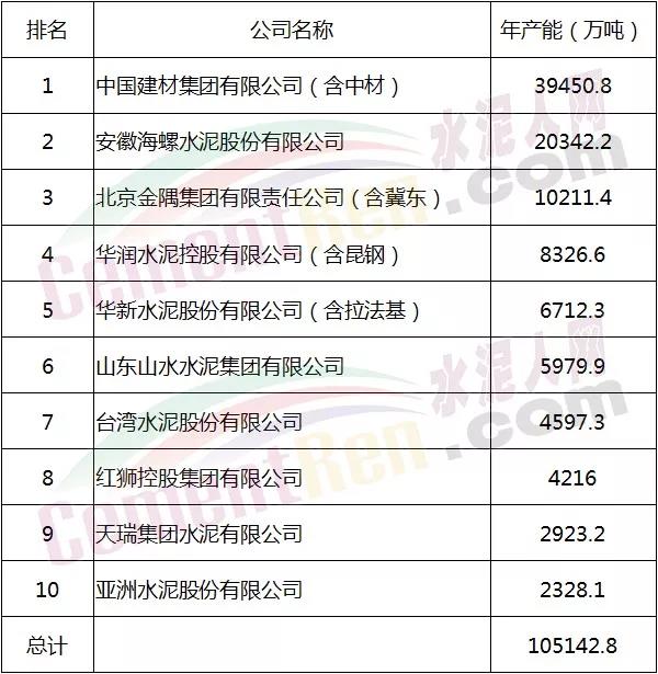 據水泥人網不完全統計,2018年全國水泥熟料產能17.16億噸,其中,全國水泥熟料前十強的熟料總產能約為10.51億噸,占全國水泥熟料產能的61.27%。