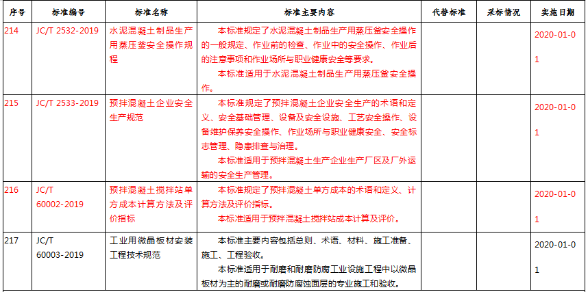 水泥行業:標準編號為JC/T 2536-2019的水泥-水玻璃灌漿材料;標準編號為JC/T 2537-2019的磷酸鎂修補砂漿;標準編號為JC/T 2532-2019的水泥混凝土制品生產用蒸壓釜安全操作規程;標準編號為JC/T 2533-2019的預拌混凝土企業安全生產規范;標準編號為JC/T 60002-2019的預拌混凝土攪拌站單方成本計算方法及評價指標;這些標準被工信部批準,并且上述這些標準實施日期都是2020年1月1日。