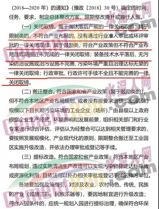 (三)提標改造。符合國家和省產業政策,符合本地區產業 布局規劃,通過實施清潔生產改造可以實現污染物穩定達標排放 或資源化利用,且依法可以補辦相關審批或登記手續的排污單位。各地要加強政策指引,對涉及農業、農村特色、傳統、民族 的產業(如唐三彩、民族樂器等),要因地制宜進行升級改造;符合入園條件的,應統一規劃入園進行提標治理,確保符合環保標準。