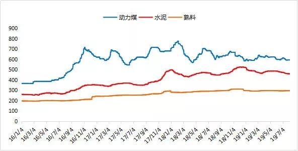 因動力煤占熟料成本的50%左右,熟料又是水泥的原材料之一,因此動力煤、熟料、水泥行情的波動有著一定的聯動關系。從圖2可以看出,自2016年供給側改革以來,國內動力煤、熟料以及水泥價格走勢--基本保持一致。從時間段來看,2016年年底,動力煤價格漲幅較大,熟料及水泥價格也在同期出現上漲情況。2017年國內動力煤炭價格同比上漲34.4%,熟料上漲31.72%,水泥上漲29.77%;2018年1-2月份動力煤、熟料和水泥的價格同時出現上漲情況,動力煤最高值為750元/噸,熟料指數為279.8,水泥價格464.99元/噸;截止2019年7月份,動力煤、熟料、水泥漲跌幅均明顯收窄,基本保持高位震蕩運行,其中動力煤同比下跌8.7%,熟料同比上漲7%,水泥同比上漲4.6%。