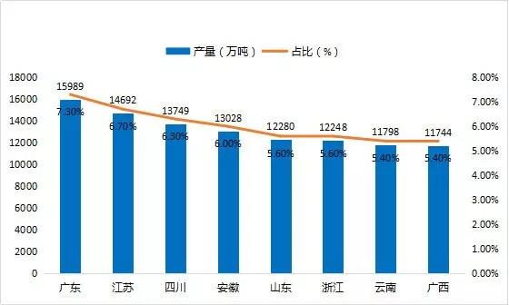 從圖4國內來看,國內水泥和熟料產量增速區域特點主要呈現“南部略強,北部偏弱”的特點,從區域劃分來看,國內水泥生產主要分布在華東、中南、西南三個區域,其中華東地區占比最大。分省市來看,2018年國內水泥生產前八大省市為廣東、江蘇、四川、安徽、山東、浙江、云南、廣西,其中廣東省2018年產量最高為15989萬噸,占比7.3%,江蘇、四川緊隨其后,分別占比6.7%、6.3%。