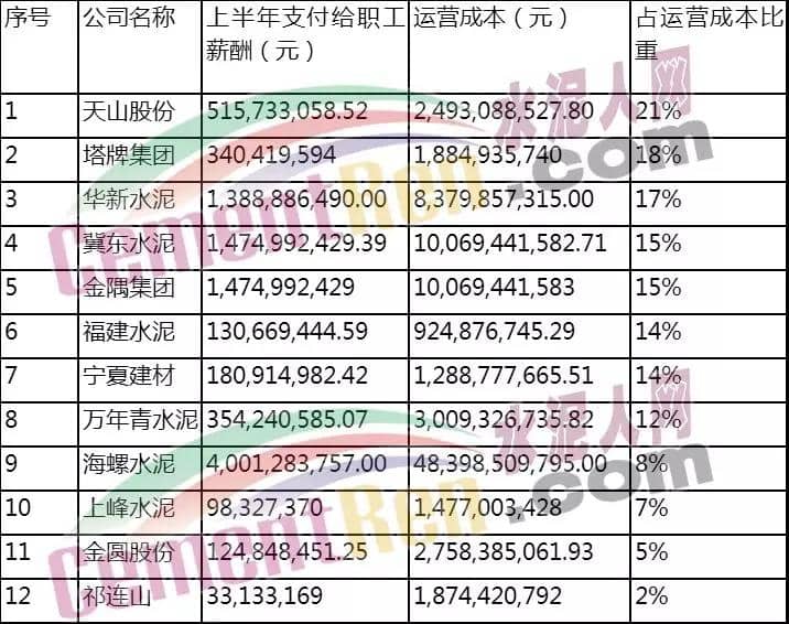 員工的薪酬支出一直被認為是企業成本上漲的主要因素, 2019年上半年各大水泥集團公司職工薪酬占運營成本的占比,從已公布的數據來看,天山股份的占比最高,達到21%,其它水泥企業基本都保持在15%左右,最低的是祁連山水泥,僅占運營成本的2%。海螺水泥以40億元支付職工薪酬排名總量第一。
