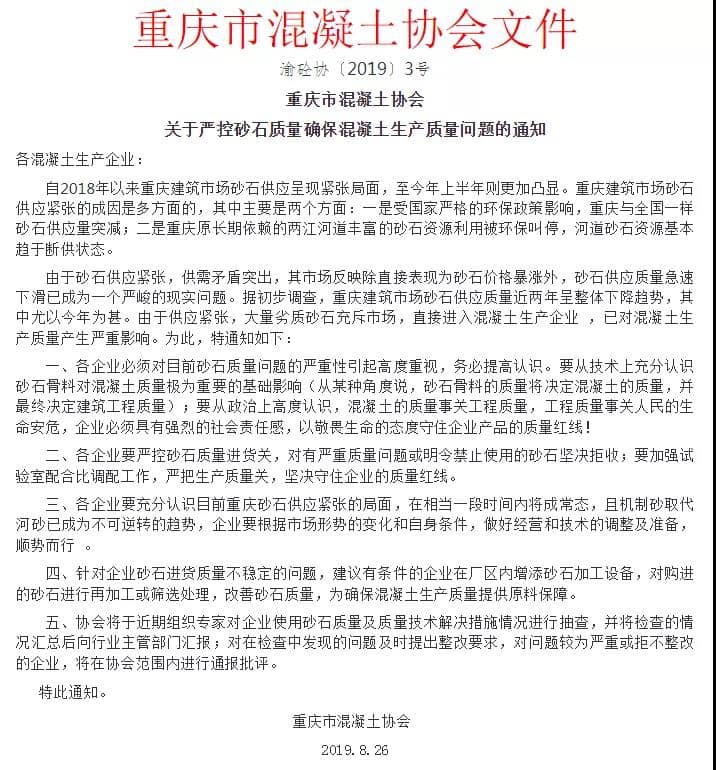 其五、重慶混凝土協會將于近期組織專家對企業使用砂石質量及質量技術解決措施情況進行抽查,并將檢查的情況匯總后向行業主管部門匯報;對在檢查過程中存在的問題及時提出整改要求,對問題較為嚴重或拒不整改的企業,將在協會范圍內進行通報批評。原文如下: