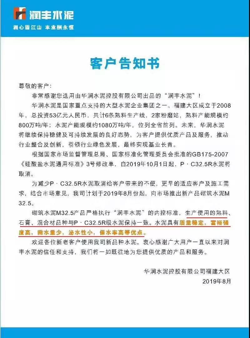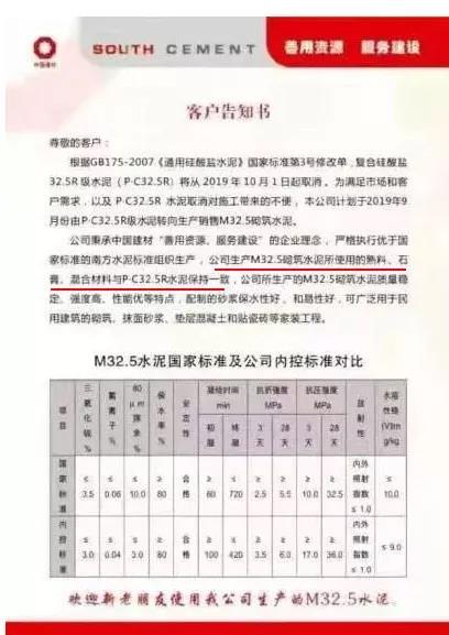南方水泥客戶告知書稱,公司生產的M32.5砌筑水泥所使用的熟料、石膏、混合材料與PC32.5R水泥保持一致。