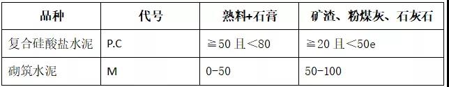 通用硅酸鹽水泥按混合材料的品種和摻量分為硅酸鹽水泥、普通硅酸鹽水泥、礦渣硅酸鹽水泥、火山灰質硅酸鹽水泥、粉煤灰硅酸鹽水泥和復合硅酸鹽水泥。其中復合硅酸鹽水泥也就是以P.C為代號的水泥品種其熟料+石膏的組分要求為大于等于50%且小于80%。