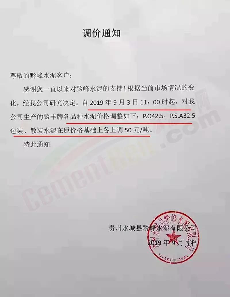 貴州六盤水豪龍水泥有限公司調價通知稱根據市場變化自9月2日8時起上調水泥價格,上調幅度50元/噸。