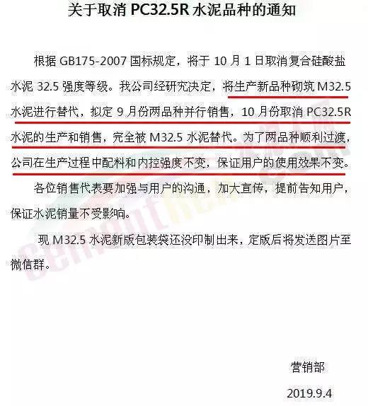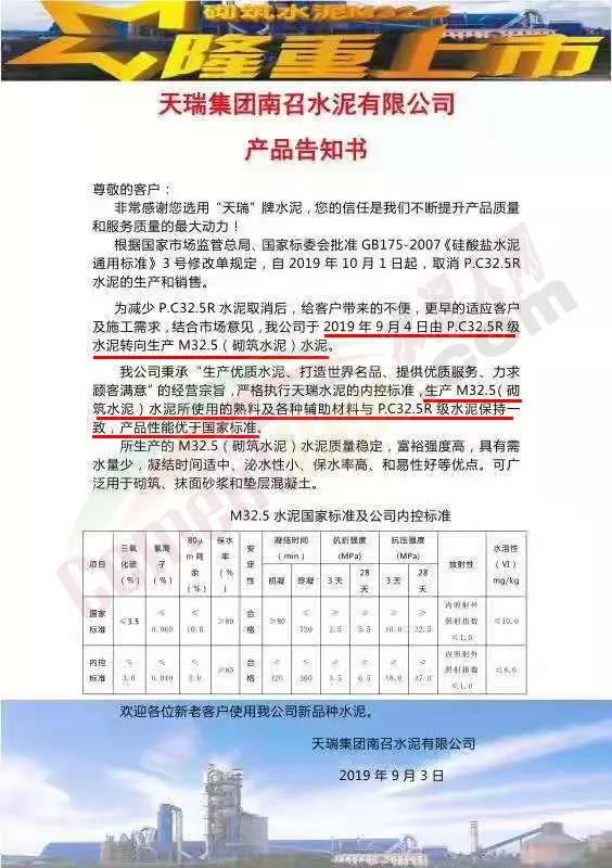 9月3日天瑞集團南召水泥有限公司發(fā)布產品告知書稱,為減少P.C32.5R水泥取消后,給客戶帶來的不便,更高適應客戶及施工需求,結合市場意見,公司將于9月4日由PC32.5R級水泥轉向生產M32.5砌筑水泥。公司將嚴格執(zhí)行天瑞水泥內控標準,生產M32.5水泥所用的熟料及各種輔助材料與P.C32.5R級水泥保持一致,且產品性能優(yōu)于國家標準。告知書原文如下:
