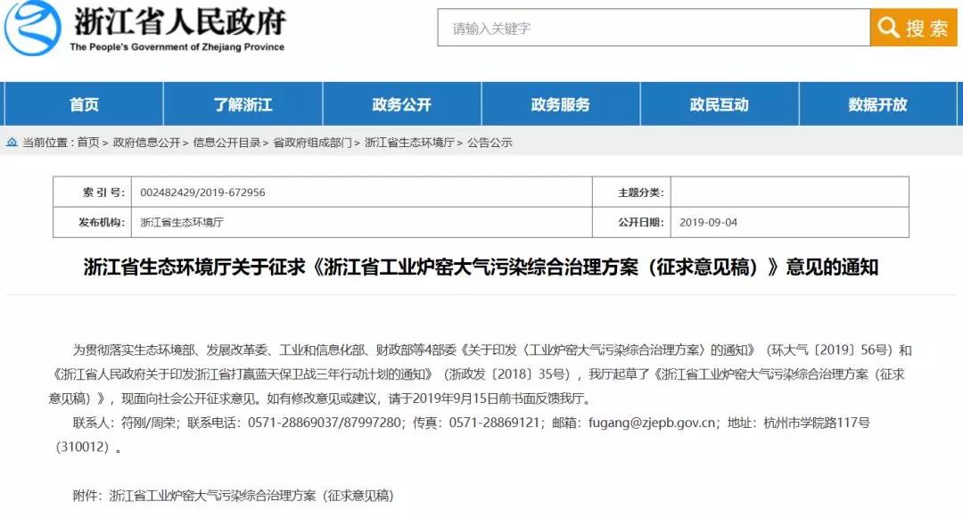 通知稱:為貫徹落實生態環境部、發展改革委、工業和信息化部、財政部等4部委《關于印發〈工業爐窯大氣污染綜合治理方案〉的通知》(環大氣〔2019〕56號)和《浙江省人民政府關于印發浙江省打贏藍天保衛戰三年行動計劃的通知》(浙政發〔2018〕35號),我廳起草了《浙江省工業爐窯大氣污染綜合治理方案(征求意見稿)》,并面向社會公開征求意見。