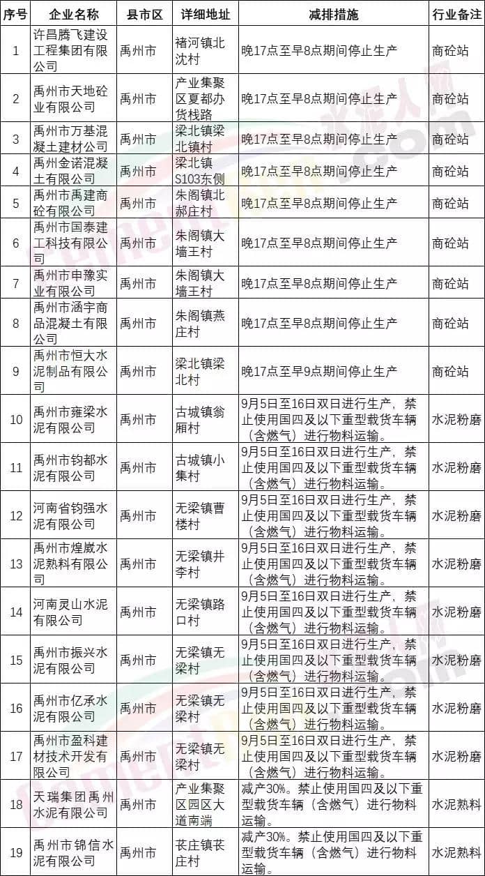 1、停產類企業。天瑞集團禹州水泥有限公司淺井分公司水泥熟料生產線、河南省湖波靈威水泥集團有限公司一期水泥熟料生產線、燒結磚瓦企業(9月6日前停產到位)、瀝青攪拌站自9月5日起停產到位。