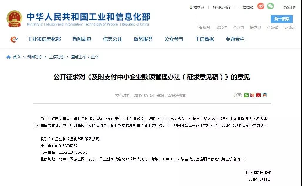 水泥人網從工信部網站獲悉,為了促進國家機關、事業單位和大型企業及時支付中小企業款項,維護中小企業合法權益,根據《中華人民共和國中小企業促進法》等法律,工業和信息化部起草了行政法規《及時支付中小企業款項管理辦法(征求意見稿)》,明確規定國家機關、事業單位和大型企業從中小企業采購貨物、工程、服務的,應當在30日內付款。