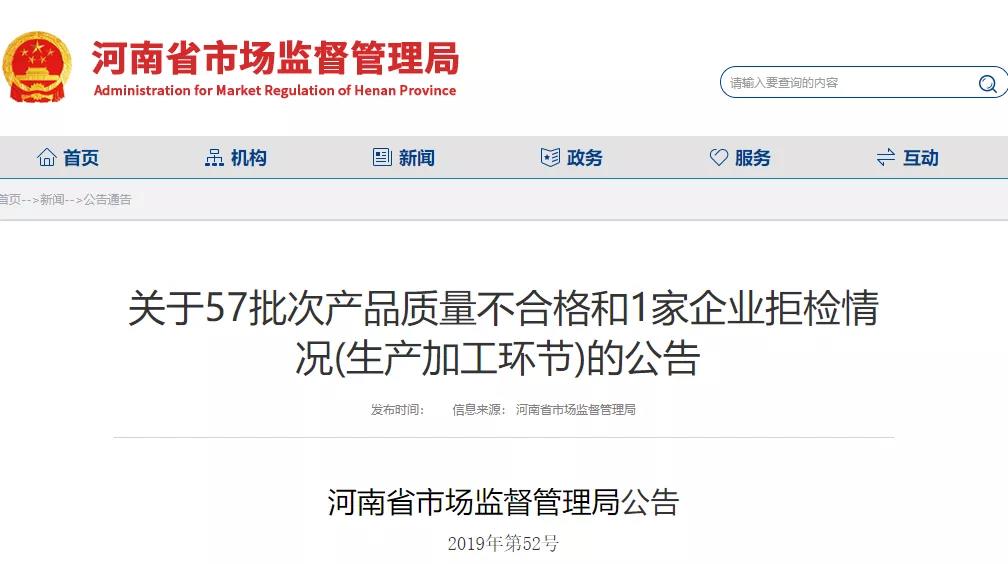 河南省市場監督管理局發布2019年第52號公告,《關于57批次產品質量不合格和1家企業拒檢情況(生產加工環節)的公告 》。河南省市場監督管理局發布2019年第52號公告詳情如下:
