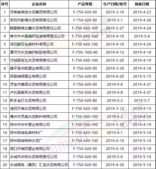 本次共抽查了21家企業,洛陽鑫磊實業有限公司因停產停業未抽到樣品。實際抽取了鄭州、洛陽、平頂山、安陽、鶴壁、新鄉、焦作、許昌、漯河、三門峽、南陽、信陽、周口等13個省轄市和永城1個省直管縣(市)20家企業生產的20批次水泥包裝袋產品。本次抽查依據GB/T9774-2010《水泥包裝袋》和《河南省2019年第2批生產加工環節水泥包裝袋產品質量監督抽查實施方案》,對水泥包裝袋產品的外觀、物理力學性能、適用溫度、牢固度、制袋材料對水泥強度的影響、防潮性能等項目進行了檢驗。經檢驗,20批次產品全部符合標準要求。
