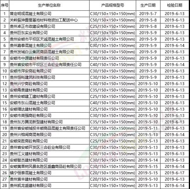 其中紫云自治縣浩翔混凝土有限公司2019年5月10日生產的預拌混凝土經安順市質量技術監督檢測所檢驗強度等級項目不合格。針對于監督抽查中發現的質量不合格產品,已通報產品生產企業所在地的縣(區)市場監督管理部門按照《中華人民共和國產品質量法》規定,迅速啟動后處理工作。截止目前市場監管部門已對上述不合格產品生產企業開展約談,企業經整改后復查抽檢合格,案件辦理還在進行中。