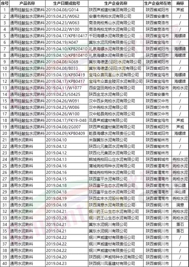 陜西省市場監督管理局關于公布2019年第2季度 通用水泥熟料產品質量監督抽查結果顯示:樣品在西安、寶雞、咸陽、銅川、渭南等地區的生產領域中抽取,共抽查生產企業30家,抽取樣品40批次,經檢驗,合格樣品40批次,樣品合格率為100%。