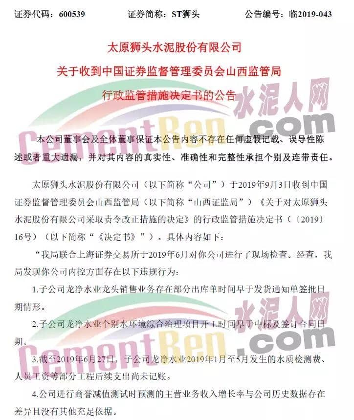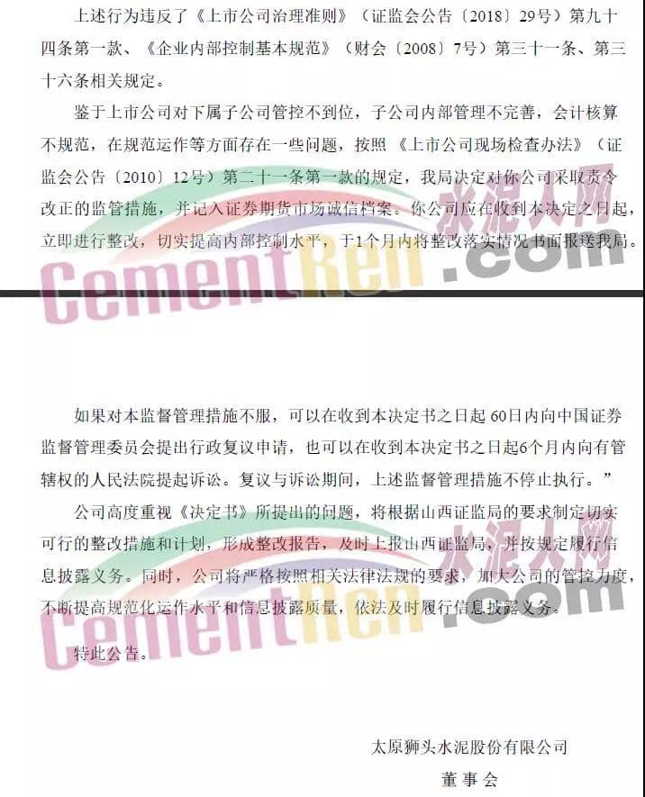 據證監會網站消息,山西監管局對太原獅頭水泥股份有限公司(簡稱ST獅頭)采取責令改正措施的決定。經查,山西監管局發現ST獅頭內控方面存在以下違規行為: