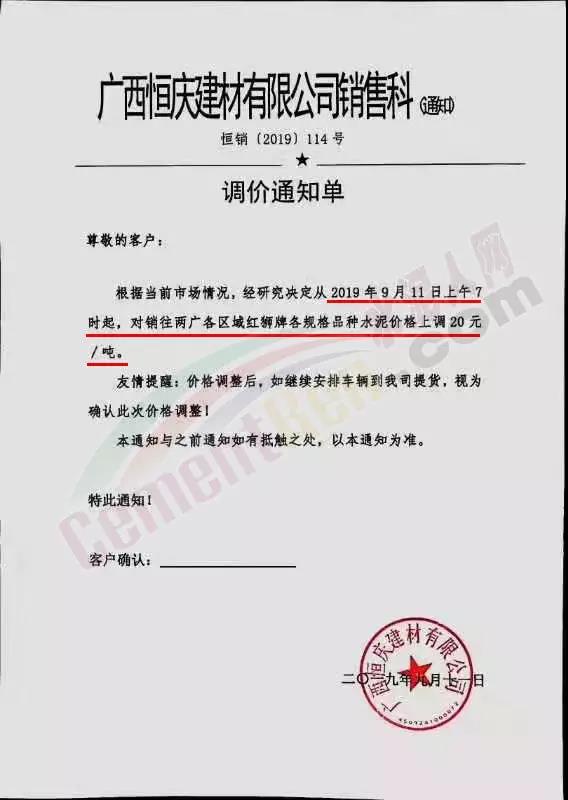 廣西恒慶建材有限公司調價通知稱,根據當前市場情況,經研究決定從9月11日上午7時起,對銷往兩廣各區域紅獅牌各規格品種水泥價格上調20元/噸。