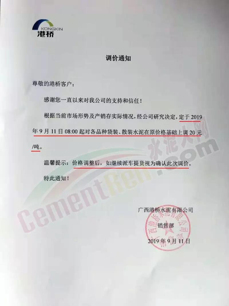廣西港橋水泥有限公司銷售部調價通知稱定于9月11日8時起對各品種袋裝、散裝水泥在原價格基礎上上調20元/噸。