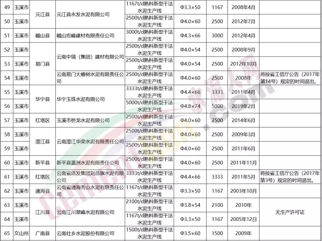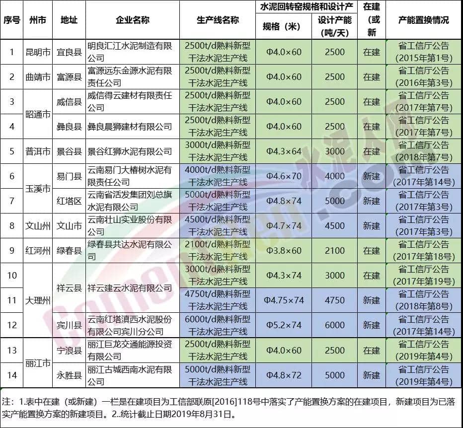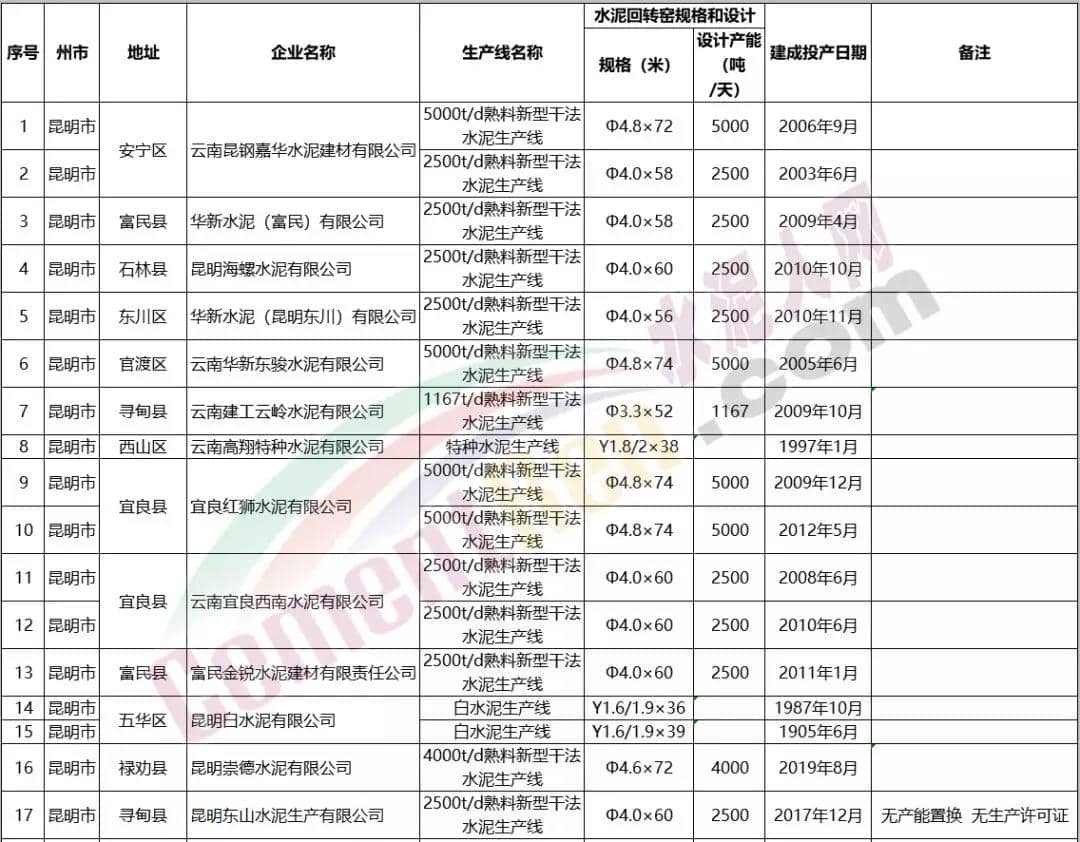 一、云南省在建新建水泥熟料生產線清單新建、在建水泥熟料生產線包括:威信得云建材有限責任公司、彝良晨獅建材有限公司、景谷紅獅水泥有限公司、云南易門大椿樹水泥有限責任公司、云南省活發集團劉總旗水泥有限公司、云南壯山實業股份有限公司、綠春縣共達水泥有限公司、祥云建云水泥有限公司、云南紅塔滇西水泥股份有限公司賓川分公司、麗江巨龍交通能源投資有限公司、麗江古城西南水泥有限公司等13家企業14條生產線。其中涉及祥云建云水泥有限公司在建項目、新建項目各一條生產線。詳情如下: