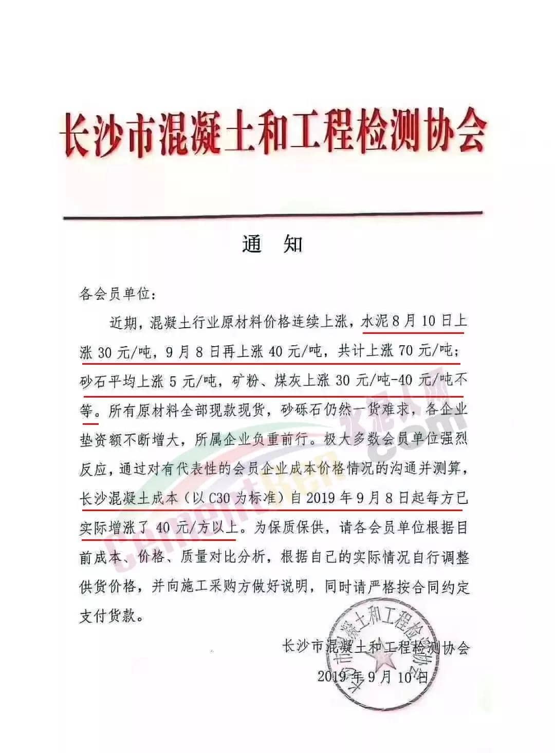 據水泥人網了解,本周二(17日)安徽六安地區混凝土行價格出現小幅上漲5元/方,市區主流品牌C30混凝土含稅非泵送價格在565-575元/方;湖南衡陽原料價格上漲,混凝土隨之上浮5-10元/方,C30非泵市場報價415-435元/方。除上述區域外,近期華東區域混凝土價格亦出現小幅上漲,12日前后山東濱州、淄博以及安徽蕪湖及銅陵混凝土價格小幅上調5元/方;華中湖南長沙部分區域上漲40元/方。詳情如下:日前,湖南省長沙市混凝土和工程檢測協會發布通知稱,近期長沙混凝土行業原材料價格連續上漲,水泥8月10日上漲30元/噸,9月8日再上漲40元/噸,共計上漲70元/噸;砂石平均上漲5元/噸,礦粉、煤灰上漲30-40元每噸不等。所有原材料全部現款現貨,砂礫石仍然一貨難求,各砼企墊資額不斷增大,所屬企業負重前行。經大多數會員單位強烈反映,通過對有代表性的會員企業成本價格情況的溝通并測算,長沙混凝土成本(以C30為標準)自2019年9月8日起每方已實際增漲了40元以上。為了在保質保量,建議各單位對目前成本,價格,質量對比分析。根據自己的實際情況自行調整供貨價格,并向施工采購方做好說明,同時請嚴格按照合同約定支付貨款。
