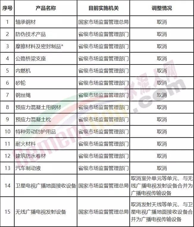 文件稱:黨中央、國務院高度重視工業產品生產許可證制度改革。《決定》明確,在近年來大幅壓減工業產品生產許可證基礎上,今年再取消內燃機、汽車制動液等13類工業產品生產許可證管理,將衛星電視廣播地面接收設備與無線廣播電視發射設備2類產品壓減合并為1類,對涉及安全、健康、環保的產品,推動轉為強制性產品認證管理,認證費用由財政負擔。經調整,繼續實施許可證管理的產品由24類減少至10類。《決定》提出,各地區、各有關部門要督促企業嚴格履行主體責任,強化信用監管和約束手段,對以欺騙手段取得生產許可證的企業,依法嚴肅處理。研究建立質量追溯體系和獎勵舉報制度,對惡意違法行為嚴懲重罰。企業要切實承擔質量安全管理責任,建立健全產品質量驗收、檢驗檢測和售后服務等制度,確保產品符合相關標準要求。《決定》強調,要全面加強事中事后監管。一是對繼續實施生產許可證管理的產品,完善對企業現場審查和檢查的技術規范,以“雙隨機、一公開”監管為手段,進一步加強和規范對獲證企業的日常檢查,對問題線索企業實施飛行檢查。二是對取消生產許可證管理的產品,充分利用信息化手段,建立健全檢驗檢測機構、科研院所、行業協會等廣泛參與的質量安全監測預警機制。加大對取消生產許可證管理產品的監督抽查力度,擴大監督抽查覆蓋面,增加抽查頻次,依法及時公開抽查信息,加大對不合格產品的查處力度,對存在行業性、苗頭性質量安全風險的產品開展專項整治。三是充分發揮行業監管、社會監督作用。加快制修訂產業發展和監管工作急需的標準,嚴格落實認證機構對認證結果的主體責任和對產品質量持續符合認證要求的連帶責任,鼓勵相關行業、用戶采信認證結果。