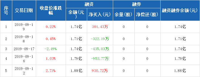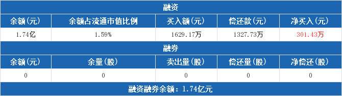 融資方面,當日融資買入1629.17萬元,融資償還1327.73萬元,融資凈買入301.43萬元。融券方面,融券賣出0股,融券償還0股,融券余量0股,融券余額0元。融資融券余額合計1.74億元。