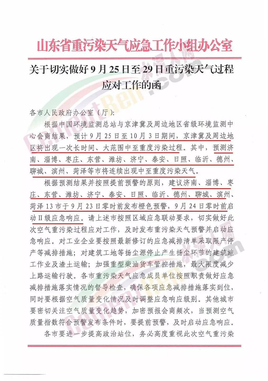 根據最新氣象預測預報和研判結果,近期我市風力較弱,濕度較高,高濕靜穩天氣特征顯著,擴散條件較差,污染累積明顯,預計我市會經歷連續的污染過程。經市攻堅指揮部研究決定,自2019年9月23日0時起,我市啟動重污染天氣紅色(Ⅰ級)預警響應,各縣(市、區)政府、管委會及市有關部門要立即采取以下應急減排措施: