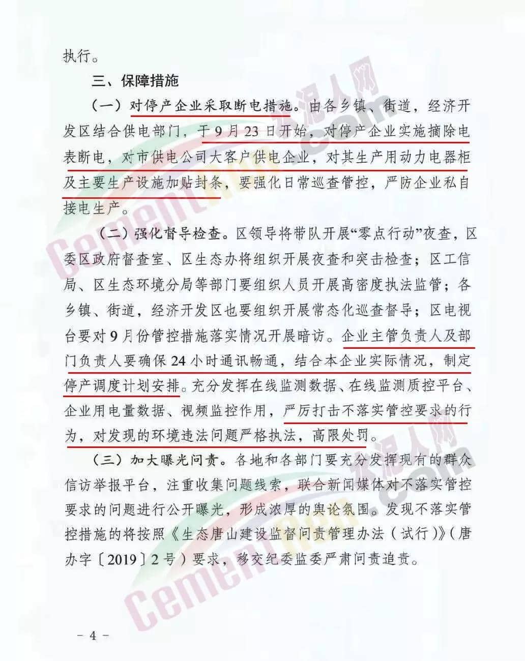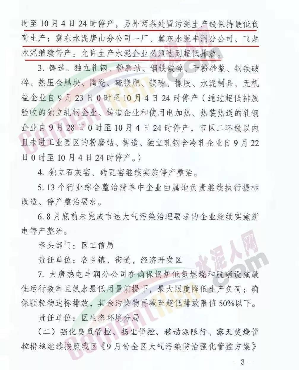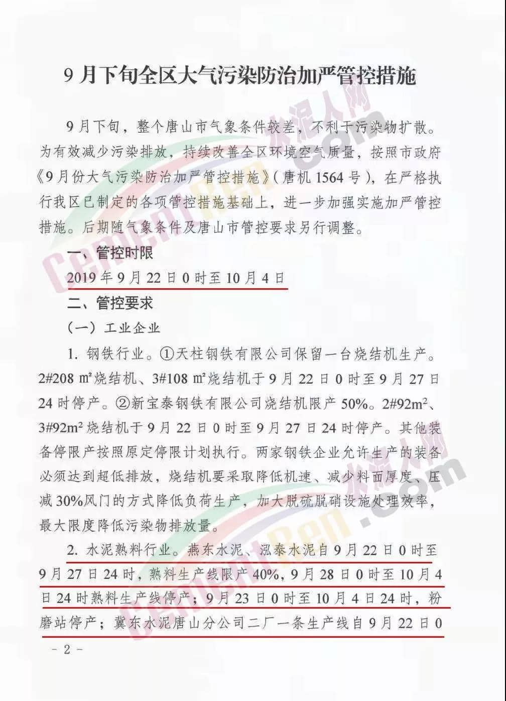 管控時限:2019年9月22日0時至10月4日水泥熟料行業:一、燕東水泥、泓泰水泥自9月22日0時至9月27日24時,熟料生產線限產40%,9月28日0時至10月4日24時熟料生產線停產;9月23日0時于10月4日24時,粉磨站停產;二、冀東水泥唐山分公司二廠一條生產線自9月22日0時至10月4日24時停產,另外兩條處置污泥生產線保持最低負荷生產;三、冀東水泥唐山分公司一廠、冀東水泥豐潤分公司、飛龍水泥繼續停產。允許生產的水泥企業必須達到超低排放。對于停產企業采取斷電措施,由各鄉鎮、街道、經濟開發區結合供電部門,于9月23日開始,對停產企業實施摘除電表斷電,對市供電公司大客戶供電企業,對其生產用動力電器柜及主要生產設施加貼封條,要強化日常巡查管控,嚴防企業私自接電生產。強化督導檢查期間,區領導將帶隊開展“零點行動”夜查,區委區政府督查室、區生態辦將組織開展夜查和突擊檢查等,區電視臺要對9月份管控措施落實情況開展暗訪。企業主管負責人及部分負責人要確保24小時通訊申通,結合本企業實際情況,制定停產調度計劃安排。嚴厲打擊不落實管控要求的行為,對發現的環境違法問題嚴格執法,高限處罰。《9月下旬大氣污染防治加嚴管控措施》全文如下: