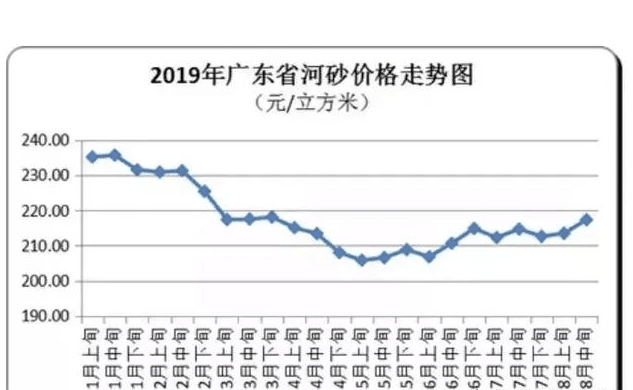 受多區域禁采以及各種的政策前提下多區域出現砂石價格飚漲,而且還伴隨著供需緊缺的情況。據了解,2019年以來,隨著河南、河北、湖北、江西等地相繼發布砂石禁采文件,砂石供應量大幅減少。截止8月中旬,廣東全省河砂平均購進價為每立方米217元,較8月上旬上升漲1.8%。其中,粵西和珠三角地區購進價漲幅較大,均價分別為每立方米220元和200元,環比分別上升3.53%和3.61%。