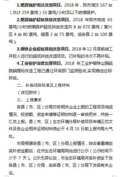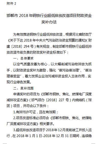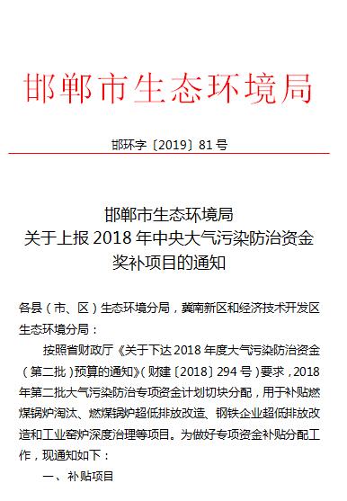 日前,邯鄲印發(fā)關于上報2018年中央大氣污染防治資金獎補項目的通知。涉及燃煤鍋爐淘汰、燃煤鍋爐超低排放改造、鋼鐵企業(yè)超低排放改造和工業(yè)爐窯深度治理等項目。