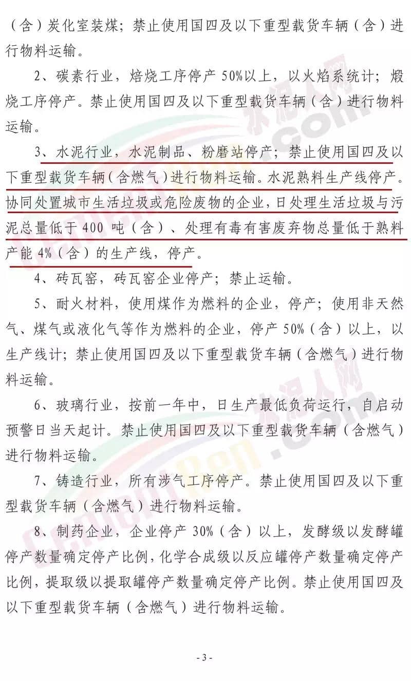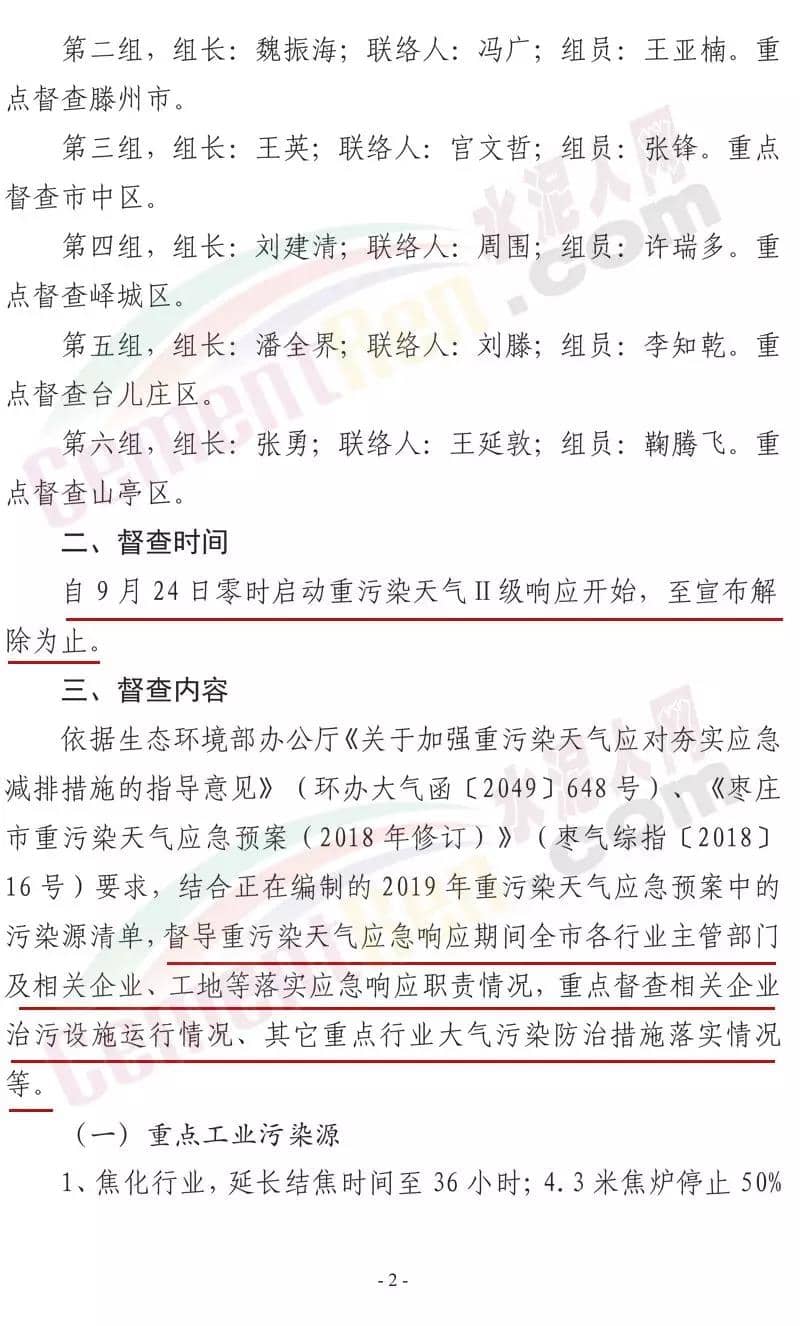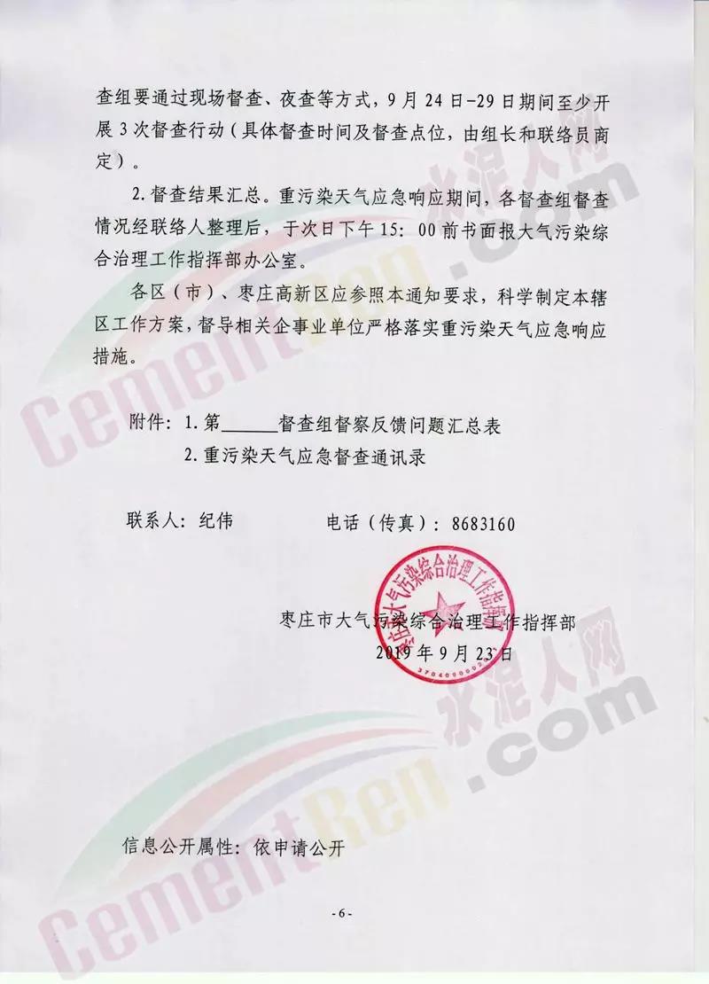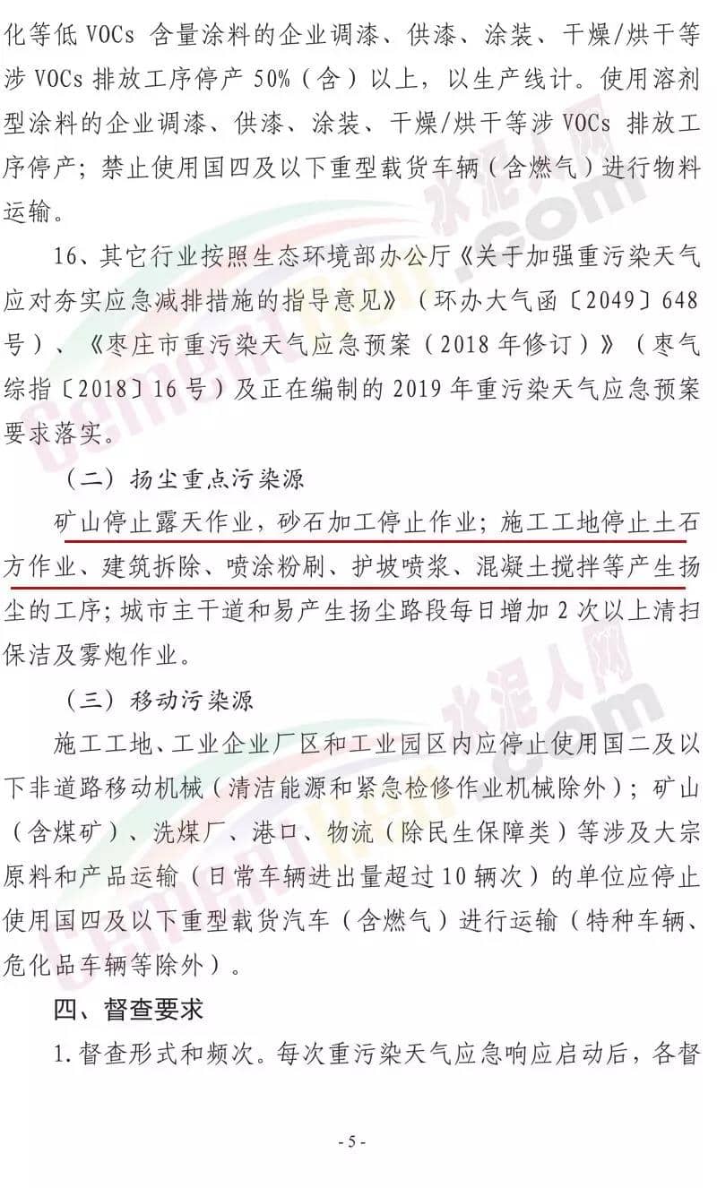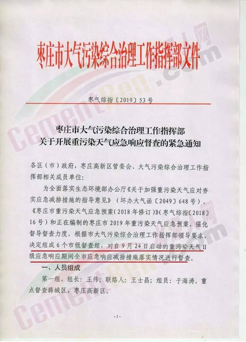 日前,山東省棗莊市大氣污染綜合治理工作指揮部發(fā)布《關(guān)于開展重污染天氣應(yīng)急響應(yīng)督查的緊急通知》稱將組成6個(gè)市級(jí)督查組,對(duì)9月24日啟動(dòng)的重污染天氣II級(jí)應(yīng)急響應(yīng)期間全市應(yīng)急響應(yīng)減排措施落實(shí)情況進(jìn)行督查。水泥行業(yè),水泥制品,粉磨站停產(chǎn);禁止使用國(guó)四及以下重型載貨車輛(含 燃?xì)?進(jìn)行物料運(yùn)輸。水泥熟料生產(chǎn)線停產(chǎn)。協(xié)同處置城市生活垃圾或危廢的企業(yè),日處理生活垃圾與污泥總量低于400噸(含)、處理有毒有害廢棄物總量低于熟料產(chǎn)能4%(含)的生產(chǎn)線停產(chǎn)。通知原文如下: