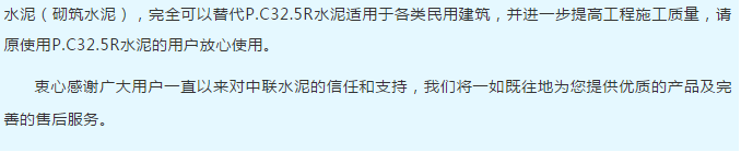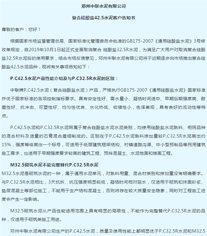據(jù)水泥人網(wǎng)區(qū)域通知員反饋,繼西峽中聯(lián)水泥發(fā)布新品客戶告知書后,近日鄧州中聯(lián)水泥也發(fā)布了復(fù)合硅酸鹽42.5水泥客戶告知書以替代即將取消的PC32.5R水泥。鄧州中聯(lián)水泥客戶告知書如下: