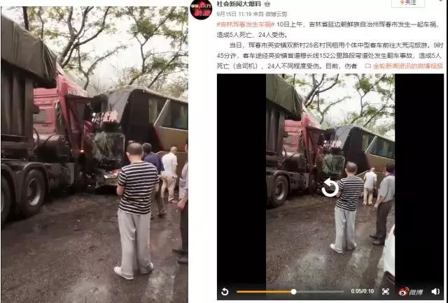 9月10日9時許,一輛吉H76716號中型客車途經吉林省延邊市琿春市英安鎮去往大荒溝村公路一處彎道時發生側翻,造成5人死亡、24人受傷。