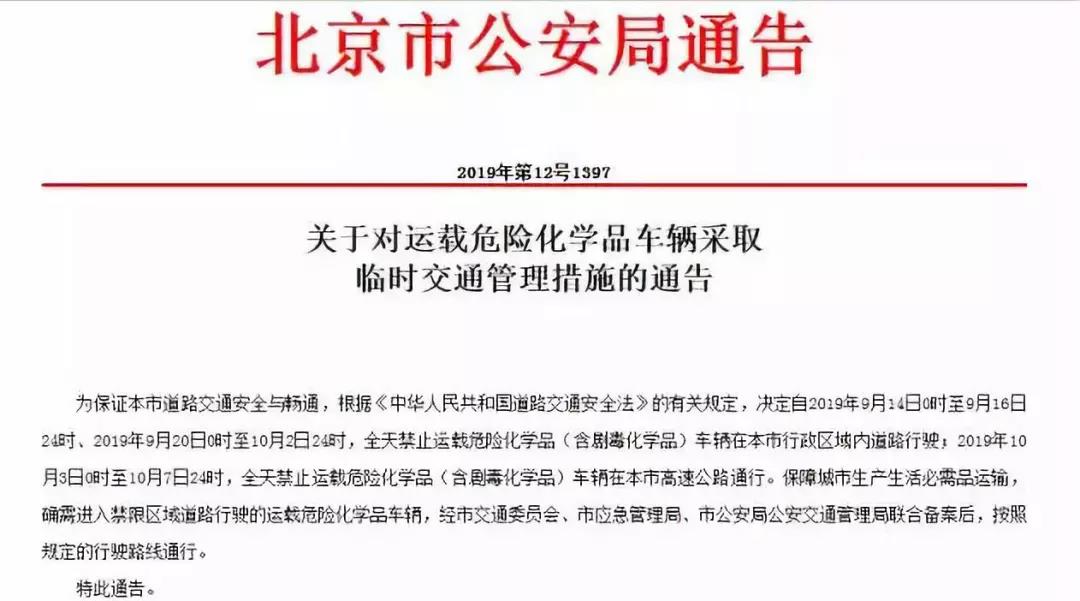 北京市:黃標車市內限行,危化車高速也限行1、每天6時至23時,五環路(不含)以內道路禁止載貨汽車通行,五環路主路禁止核定載質量8噸(含)以上載貨汽車通行。2、排放達不到國Ⅲ標準的柴油車,全天禁止進入六環路(含)以內道路和遠郊區縣城關鎮主要道路通行;本市相關部門不予辦理營運證和通行證。3、9月20日0時至10月2日24時,全天禁止運載危險化學品(含劇毒化學品)車輛在本市行政區域內道路行駛;2019年10月3日0時至10月7日24時,全天禁止運載危險化學品(含劇毒化學品)車輛在本市高速公路通行。