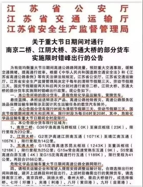 湖南省:全省禁行危險品車輛2019年10月1日0時至2019年10月8日6時,湖南全省高速公路禁止危險化學品運輸車輛通行。