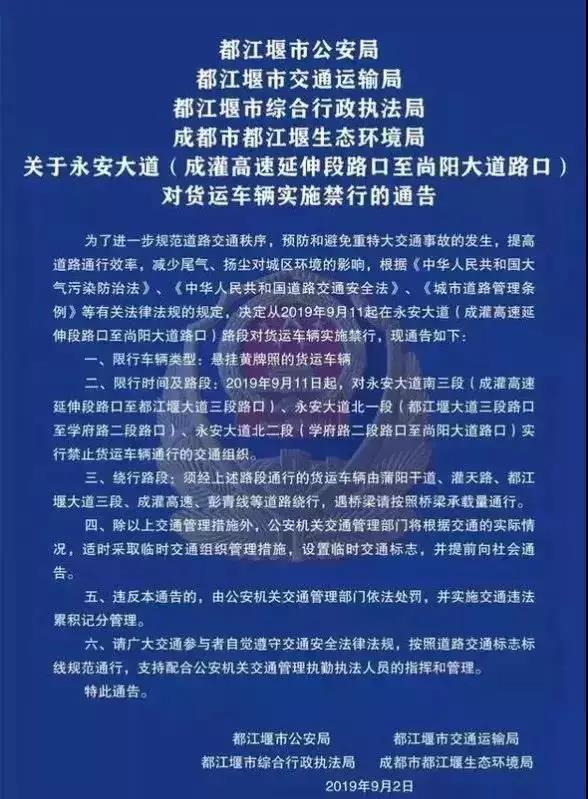 四川省:國慶期間全天禁行1、全省高速公路禁止危險化學品運輸車輛通行。2、成都市全市每日07:30-20:00限行國四以下排放貨車。