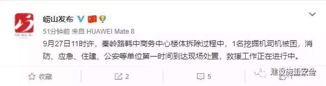 微博內(nèi)容截圖據(jù)嶗山發(fā)布官方微博發(fā)布消息稱,9月27日11時(shí)許,青島市嶗山區(qū)秦嶺路韓中商務(wù)中心樓體拆除過程中,1名挖掘機(jī)司機(jī)被困,消防、應(yīng)急、住建、公安等單位第一時(shí)間到達(dá)現(xiàn)場(chǎng)處置,救援工作正在進(jìn)行中。 據(jù)知情人透露,該項(xiàng)目的拆除工作是由和達(dá)集團(tuán)進(jìn)行施工,現(xiàn)場(chǎng)突發(fā)意外整個(gè)樓體瞬間崩塌,挖掘機(jī)被埋。事故現(xiàn)場(chǎng)正進(jìn)行多方救援