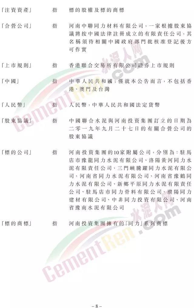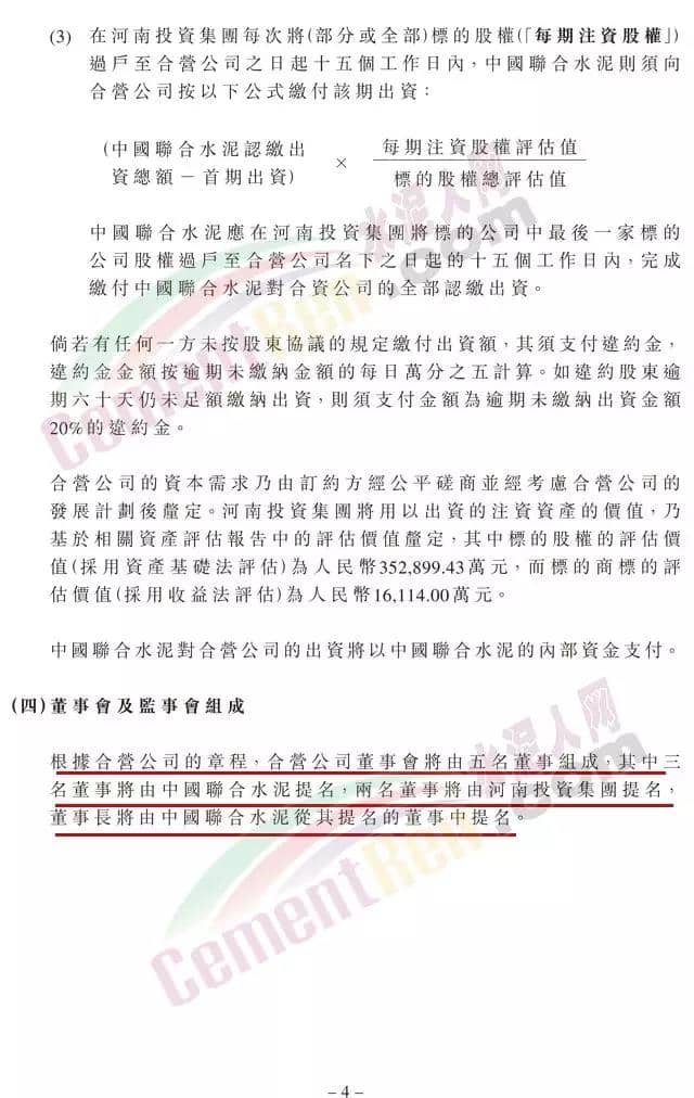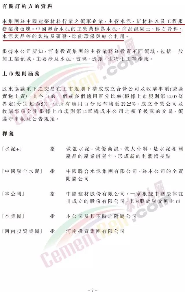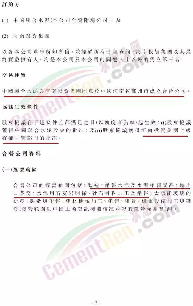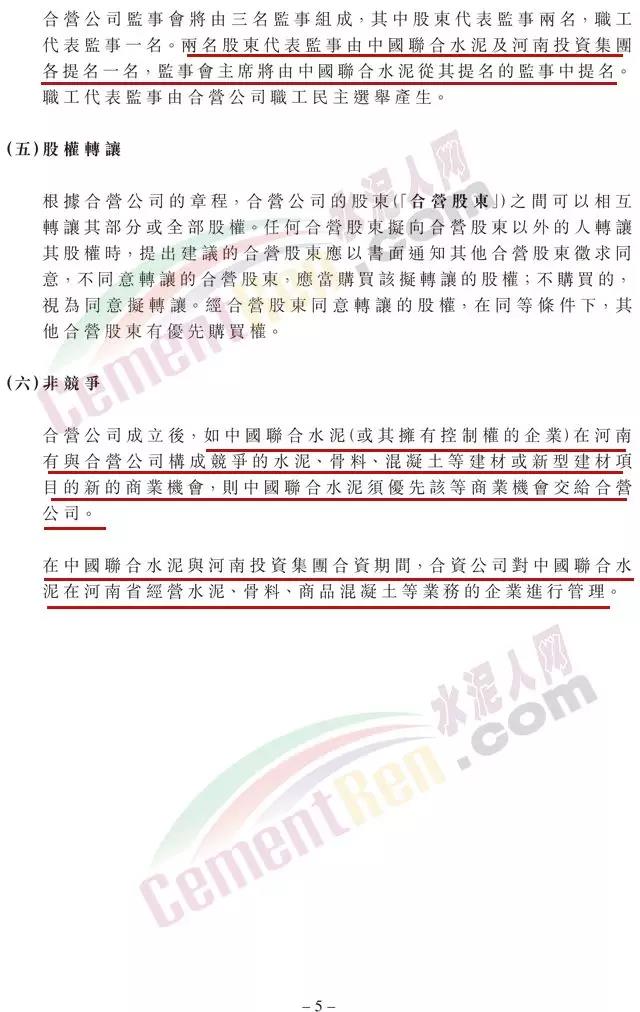 合營公司成立后,如中國聯合水泥(或其擁有控制權的企業)在河南有與合營公司構成競爭的水泥、骨料、混凝土等建材或新型建材項目的新的商業機會,則中國聯合水泥須優先該等商業機會交給合營公司。在中國聯合水泥與河南投資集團合資期間,合資公司對中國聯合水泥在河南省經營水泥、骨料、商品混凝土等業務的企業進行管理。