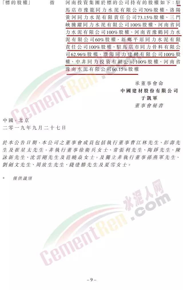 河南省內大型水泥企業集團區域分布相對獨立,中國聯合水泥的附屬公司與河南投資集團屬下的“同力”系列水泥集團各自的業務現分布在河南省的不同區域。該公司預期股東協議項下之交易將有利于強化中國聯合水泥于河南省的地位,并將整合雙方資源,主要體現于成本下降、進一步發揮企業優勢及配合集團發展“水泥+”的戰略,在河南省建設集水泥、商混、骨料和水泥制品為一體的大型建材產業集團。交易亦符合河南省人民政府鼓勵區內重點水泥企業進行重組以調整產業結構的政策。
