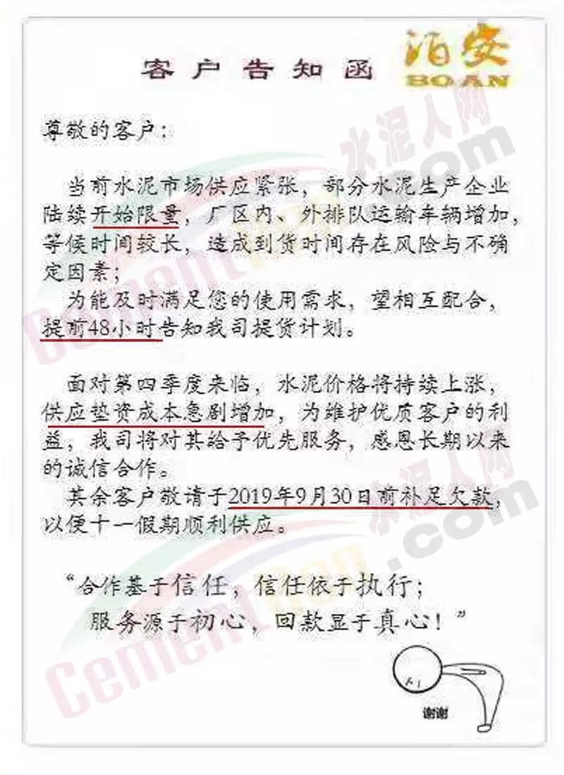 水泥人網通訊員消息:日前,泊安水泥發布客戶告知函稱,當前水泥市場供應緊張,部分水泥生產企業陸續開始限量,廠區內、外排隊運輸車輛增加,等候時間較長,造成到貨時間存在風險與不確定因素;為能及時滿足客戶使用需求,須提前48小時告知提貨計劃。面對第四季度來臨,水泥價格將持續上漲,供應墊資成本急需增加,為維護優質客戶的利益,公司將對其給予優先服務,其余客戶須于9月30日前補足欠款,以便十一假期順利供應。