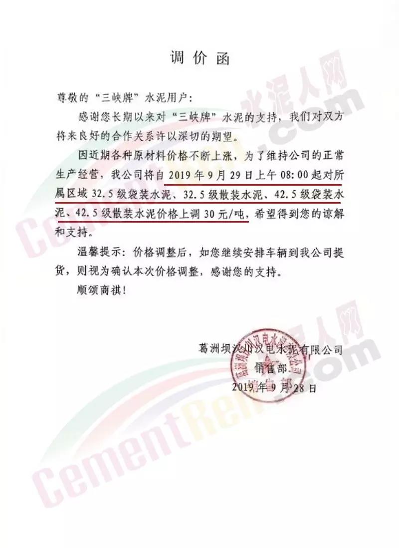 葛洲壩漢川漢電水泥有限公司通知自9月29日上午8時起對所屬區域 32.5級及42.5級袋散裝水泥上調30元/噸。