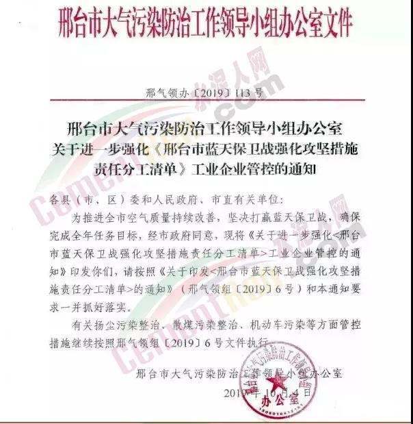 水泥人網消息:10月4日,邢臺大氣辦發布關于進一步強化《邢臺市藍天保衛戰強化攻堅措施責任分工清單》工業企業管控的通知