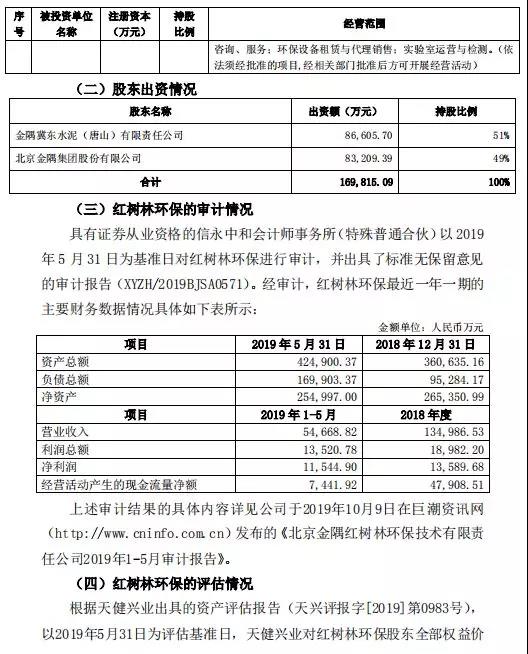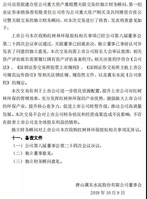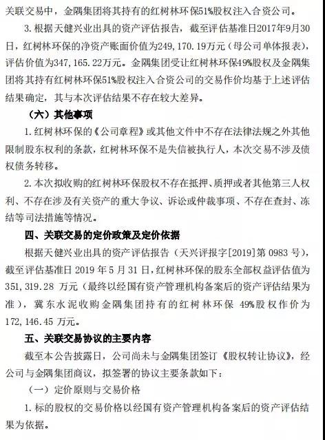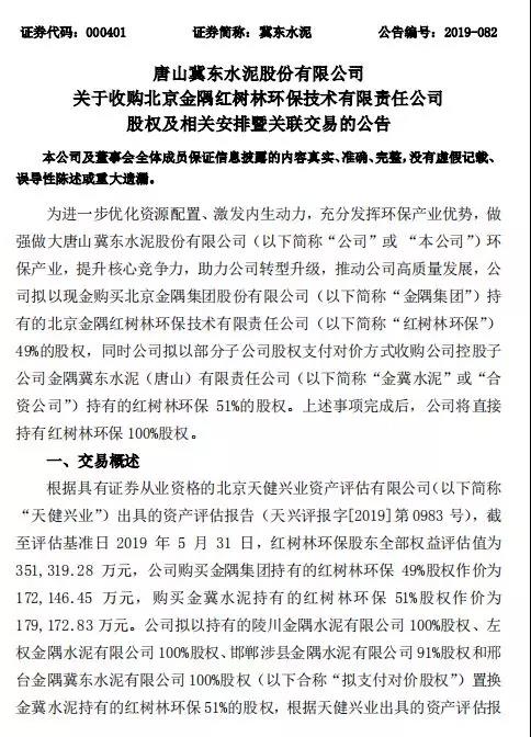 冀東水泥公告,擬現(xiàn)金收購金隅集團(tuán)持有的紅樹林環(huán)保49%股權(quán),同時擬以部分子公司股權(quán)支付對價方式收購控股子公司金冀水泥持有的紅樹林環(huán)保51%股權(quán)。交易完成后,冀東水泥將直接持有紅樹林環(huán)保100%股權(quán)。公告全文如下: