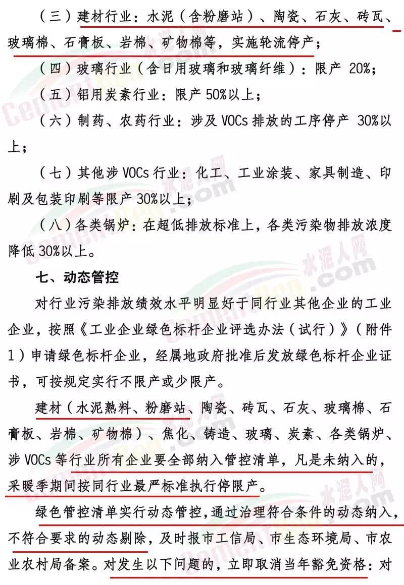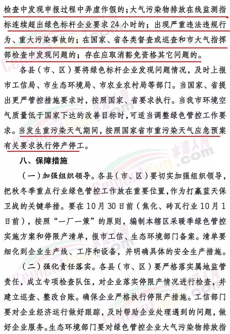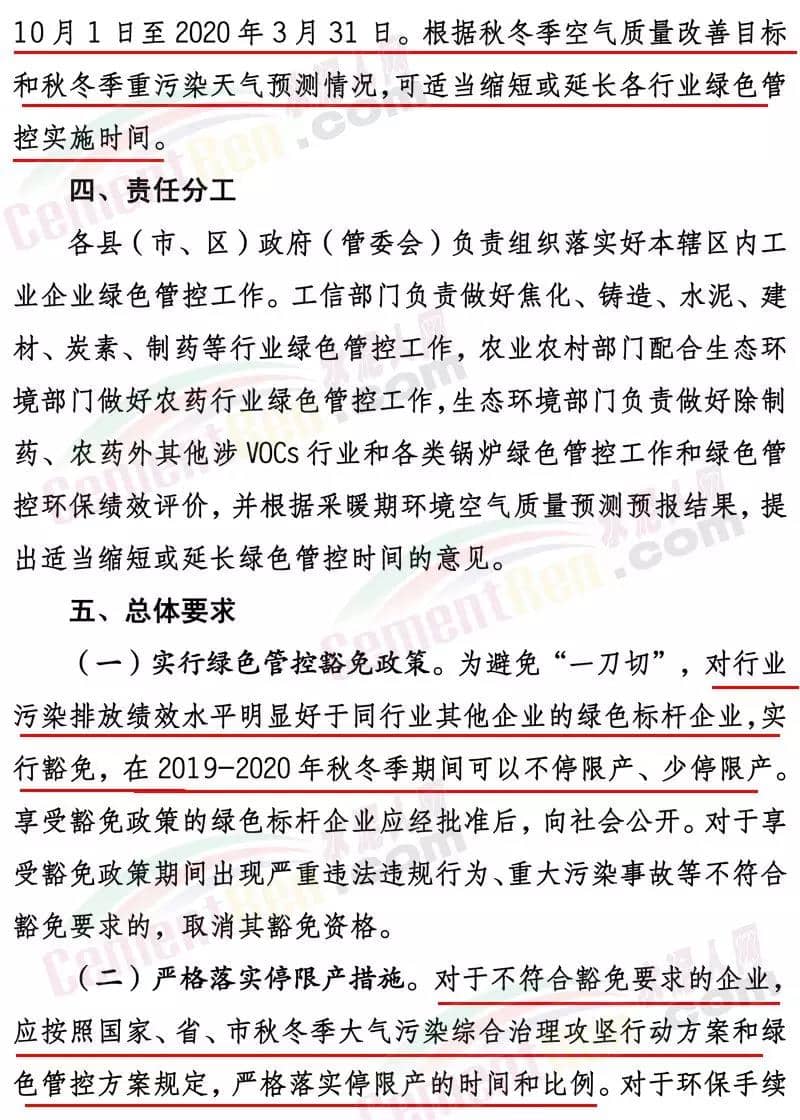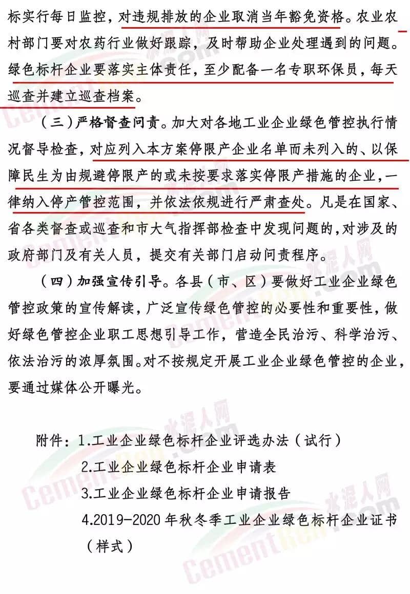 濟寧市2019-2020年秋冬季工業企業綠色管控實施方案(試行)文件要求工業企業秋冬季綠色管控實施時間原則上為秋冬季2019年10月1日至2020年3月31日。根據秋冬季空氣質量改善目標和秋冬季重污染天氣預測情況,可適當縮短或延長各行業綠色管控實施時間。其中建材行業水泥(含粉磨站)、陶瓷、石灰、磚瓦、玻璃棉、石膏板、巖棉、礦物棉等,實施輪流停產; 總體要求(一)實行綠色管控豁免政策。為避免“一刀切”,對行業污染排放績效水平明顯好于同行業其他企業的綠色標桿企業,實行豁免,在2019-2020年秋冬季期間可以不停限產、少停限產。享受豁免政策的綠色標桿企業應經批準后,向社會公開。對于享受豁免政策期間出現嚴重違法違規行為、重大污染事故等不符合豁免要求的,取消其豁免資格。(二)嚴格落實停限產措施。對于不符合豁免要求的企業,應按照國家、省、市秋冬季大氣污染綜合治理攻堅行動方案和綠色管控方案規定,嚴格落實停限產的時間和比例。對于環保手續不全、各類污染物不能穩定達標排放、監測數據造假、涉嫌偷排偷放、未按期完成2019-2020年秋冬季大氣污染綜合治理改造任務的企業,實施停產整治。對屬于《產業結構調整指導目錄》限制類的,提高限產比例或實施停產。(三)優先突出民生保障。對于應停限產企業若涉及供暖、協同處置城市垃圾或危險廢物、保障城市正常運轉或涉及國家戰略性產業的工業企業和重大工程項目等保民生任務的,應優先保障基本民生需求,在滿足保障任務的同時,根據其承擔的協同處置量和供暖面積等參數核定最大允許生產負荷科學制定減排措施。對因保民生任務的,報縣級人民政府批準,并由相關部門按有關要求報上級部門備案。(四)嚴格落實限產比例。對于采用限產方式的企業,要嚴格限產比例,限產比例應當優先采取生產線或生產工序停產方式達到,限產比例原則上以2019年4至10月期間企業正常生產(指生產負荷在75%以上)的平均產量為基準核算。對確實無法停產的生產線或生產設備,或因保民生任務不能完全停產的,應當以企業產品產量或用電量計限產負荷。(五)鼓勵優秀企業發展。凡列入工信部綠色工廠或我市“510”企業培育工程名單的企業,在穩定達標排放的前提下,以相應要求為基礎,可享受不高于25%優惠政策。動態管控對行業污染排放績效水平明顯好于同行業其他企業的工業企業,按照《工業企業綠色標桿企業評選辦法(試行)》申請綠色標桿企業,經屬地政府批準后發放綠色標桿企業證書,可按規定實行不限產或少限產。建材(水泥熟料、粉磨站、陶瓷、磚瓦、石灰、玻璃棉、石膏板、巖棉、礦物棉)、焦化、鑄造、玻璃、炭素、各類鍋爐、涉VOCs等行業所有企業要全部納入管控清單,凡是未納入的,采暖季期間按同行業最嚴標準執行停限產。綠色管控清單實行動態管控,通過治理符合條件的動態納入,不符合要求的動態剔除,及時報市工信局、市生態環境局、市農業農村局備案。對發生以下問題的,立即取消當年豁免資格:對檢查中發現申報過程中弄虛作假的;大氣污染物排放在線監測指標連續超出綠色標桿企業要求24小時的;出現嚴重違法違規行為、重大污染事故的;在國家、省各類督查或巡查和市大氣指揮部檢查中發現問題的;存在應取消豁免資格其它問題的。各縣(市、區)要將綠色標桿企業發現問題情況,及時上報市工信局、市生態環境局、市農業農村局等部門。當國家、省提出更嚴管控措施要求時,按照國家、省要求執行。當我市環境空氣質量低于國家下達的改善目標時,可適當調整綠色管控工作要求。當發生重污染天氣期間,按照國家省市重污染天氣應急預案有關要求執行停產停工。強化責任落實。各縣(市、區)要嚴格落實屬地監管責任,成立專項檢查隊伍,對企業落實停限產情況進行檢查,并建立巡查、整改臺賬。確保企業嚴格執行停限產措施。工信部門要對企業經濟運行做好跟蹤,及時幫助企業處理遇到的問題,做好企業服務。生態環境部門要對綠色管控企業大氣污染物排放指標實行每日監控,對違規排放的企業取消當年豁免資格。農業農村部門要對農藥行業做好跟蹤,及時幫助企業處理遇到的問題。綠色標桿企業要落實主體責任,至少配備一名專職環保員,每天巡查并建立巡查檔案。嚴格督查問責。加大對各地工業企業綠色管控執行情況督導檢查,對應列入本方案停限產企業名單而未列入的、以保障民生為由規避停限產的或未按要求落實停限產措施的企業,一律納入停產管控范圍,并依法依規進行嚴肅查處。凡是在國家、省各類督查或巡查和市大氣指揮部檢查中發現問題的,對涉及的政府部門及有關人員,提交有關部門啟動問責程序。
